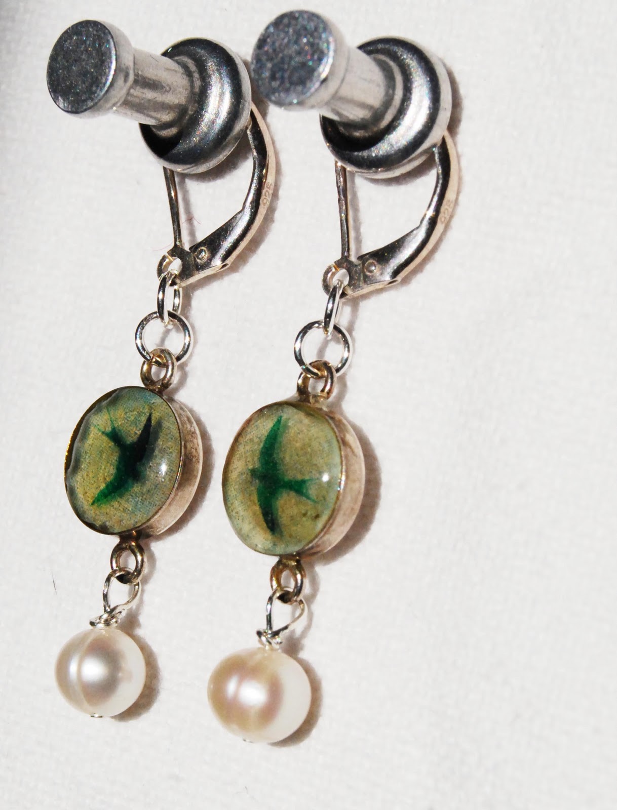 | Fine silver bezels encase swallows. Accented with freshwater pearls. On the way to a new owner. |